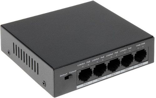 SWITCH POE DAHUA PFS3005-4P-58 przeznaczony jest do zasilania kamer IP pracujących w standardzie IEEE 802.3af. Switch na portach od 1 do 4 posiada funkcję automatycznej detekcji urządzeń zasilanych w standardzie PoE. Dodatkowy port oznaczony UPLINK służy do podłączenia kolejnego urządzenia sieciowego. Na panelu przednim znajduje się sygnalizacja stanu pracy urządzenia zrealizowana na diodach LED. Technologia PoE zapewnia połączenie sieciowe oraz obniża koszty instalacji, eliminując potrzebę doprowadzania oddzielnego kabla zasilającego do każdego urządzania. Oprócz kamer w ten sposób mogą być zasilane urządzenia sieciowe, które korzystają z tej technologii np. telefon IP, access point, router.