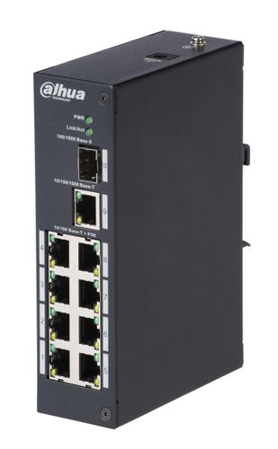 SWITCH POE DAHUA PFS3110-8P-96 przeznaczony jest do zasilania kamer IP pracujących w standardzie IEEE 802.3af/at. Urządzenia może być stosowany w instalacjach realizowanych w obiektach przemysłowych w niekorzystnych warunkach takich jak wysoka lub niska temperatura. Switch na portach od 1 do 8 posiada funkcję automatycznej detekcji urządzeń zasilanych w standardzie PoE. Dodatkowy porty 7,8 służą do podłączenia kolejnych urządzeń sieciowych. Port SFP wymaga dokupienia modułu SFP. Na panelu przednim znajduje się sygnalizacja stanu pracy urządzenia zrealizowana na diodach LED. Technologia PoE zapewnia połączenie sieciowe oraz obniża koszty instalacji, eliminując potrzebę doprowadzania oddzielnego kabla zasilającego do każdego urządzania. Oprócz kamer w ten sposób mogą być zasilane urządzenia sieciowe, które korzystają z tej technologii np. telefon IP, access point, router.