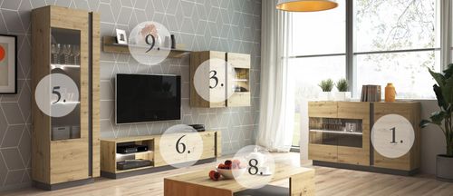 Nowoczesna kolekcja mebli w dwóch kolorach. Jeden bardziej męski, drugi delikatniejszy kobiecy. Pierwszy wyrazisty, szlachetny dąb podkreślony kontrastujących grafitem, nadaje bryłom mebli charakteru.