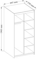 Szafa dwudrzwiowa wykonana jest z wysokiej jakości drewna, odpornego na zarysowania i pęknięcia. Wnętrze szafy jest bardzo funkcjonalne, posiada pojemne półki oraz drążek, dzięki temu, w porządku, pomieści się bardzo dużo ubrań lub innych przedmiotów użytku codziennego. Szafa dostępna jest w kilku wersjach kolorystycznych, pozwoli to dopasować wygląd szafy do koncepcji wnętrz sypialni, przedpokoju