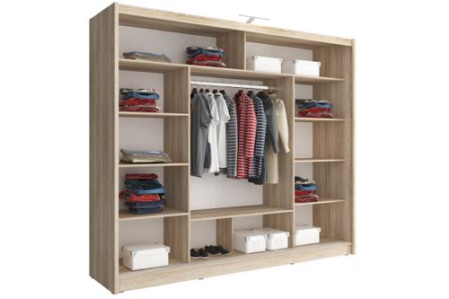 Szafa w nowoczesnym stylu. Wyposażona w półki, drążek i system drzwi przesuwnych. Wykonana z płyty laminowanej, charakteryzującą się wysoką odpornością na wilgoć i wysokie temperatury.