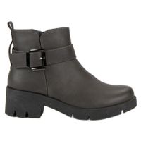 Damskie workery na dwu centymetrowej platformie, z obcasem o wysokości pięciu centymetrów. Buty wykonane ze skóry ekologicznej w szarym kolorze. Model z szerszą cholewką sięgającą ponad kostkę. Model zapinany na zamek. Workery sprawdzą się jesienią i zimą do stylizacji w rockowym stylu. Na wysokości kostek znajduje się ozdobny pasek ze sprzączką.