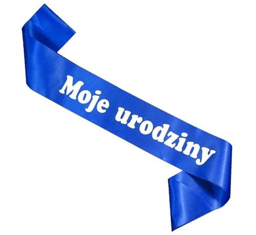 Satynowa szarfa w kolorze ciemno-niebieskim z nadrukiem napisu Moje urodziny. Długość szarfy ok. 83 cm, szerokość 10 cm