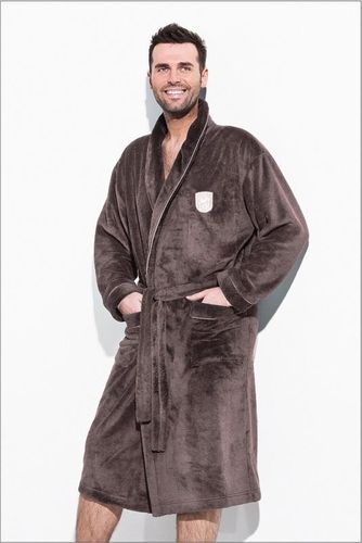 Ciepły i miękki szlafrok męski, wykonany z wysokiej jakości tkanin. Posiada kieszenie oraz wiązanie w pasie. Efektowny kołnierz zapewnia ciepło i ładnie komponuje się z całością. Posiada niewielki haft w okolicach piersi. Wykończony jasną lamówką. Dostępny w kilku wersjach kolorystycznych. Bardzo praktyczny i wygodny.