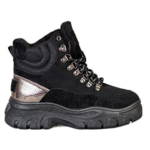 Czarne, sznurowane botki - traperki to buty idealne na jesień i zimę. Łączą klasykę z nutką oryginalności, a zastosowanie srebrzystych, zwierzęcych printów sprawia, że pozostają w trendzie. Gruba na aż 5 cm platforma doskonale amortyzuje kroki i doskonale je stabilizuje na każdej powierzchni, również mokrej, zaśnieżonej i oblodzonej.
