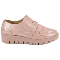Stylowe, damskie półbuty Comer w kolorze, jasnego, pudrowego różu. Buty wykonane z ekologicznego materiału o pięknym, brokatowym połysku. Bardzo wygodne i komfortowe w noszeniu, dzięki wysokiej, 4cm platformie z protektorem. Wyjątkowo nowoczesny, a zarazem kobiecy model, który sprawdzi się w każdej miejskiej stylizacji.