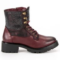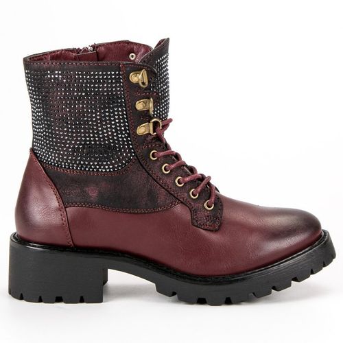 Damskie workery wykonane ze skóry ekologicznej w czerwonym kolorze. Mają zaokrąglony nosek, przecierany na czarno. Cholewka o wysokości sięgającej nad kostkę, ozdobiona jest drobnymi kryształkami. Buty odpowiednie na jesień i zimę, maja dwu-centymetrową platformę, która doskonale oddziela stopę od chłodnej powierzchni.