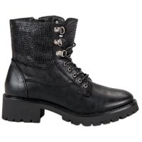 Workery o klasycznym kroju w rockowym stylu, wykonane zostały ze skóry ekologicznej w czarnym kolorze. Mają cholewkę o wysokości sięgającej ponad kostki, która dodatkowo ozdobiona została drobnymi, czarnymi kryształkami. Buty wiązane są na sznurówki, ale posiadają wszyty zamek w celu łatwiejszego zakładania i zdejmowania.