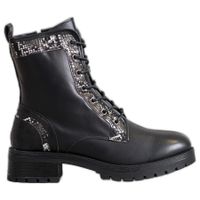 Modne i wygodne botki damskie w kolorze ponadczasowej czerni. Cholewka za kostkę świetnie chroni przed niekorzystnymi warunkami pogodowymi. Zamek błyskawiczny znacznie ułatwia zdejmowanie i zakładanie botków. Uwagę z pewnością przyciąga zwierzęcy wzór na cholewce, idealnie wpisuje się on w aktualnie obowiązujące trendy w modzie. Buty spodobają się miłośniczkom stylu rockowego i militarnego.