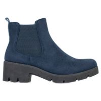 Sztyblety wykonane z ekologicznej skóry o zamszowym wykończeniu mają cholewki sięgające za kostkę w niebieskim kolorze. Buty te są wsuwane, wstawki z elastycznych gumek umieszczone po obu stronach cholewki ułatwiają ich wkładanie. Szeroki obcas o wysokości 5 cm i 2-centymetrowa platforma zapewniają wygodę.