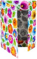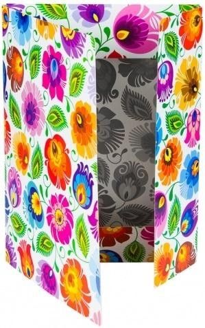 Teczka kartonowa z motywem łowickich kwiatów z wycinanki- projekt inspirowany tradycyjnymi wzorami ludowymi z wycinanek łowickich- podstawowymi elementami wycinanek łowickich są koguty, pawie oraz motywy kwiatowe- wykonana z kartonu (330g/m2), strona zewnętrzna laminowana- wewnątrz jednokolorowy nadruk wzoru z opisem regionu- rozmiar dostosowany do dokumentów A4- zamykana na gumkę- idealna na dokumenty, notatki- niezbędna w biurze, domu, szkole