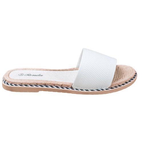 Klasyczne, białe klapki Renda doskonale sprawdzą się na co dzień. Jest to model tekstylny, posiadający 1-centymetrowy obcas oraz gładką podeszwę. Dzięki wkładkom ze skóry ekologicznej buty te są wygodne, dlatego będą one świetnym wyborem na lato. Można je nosić jako dodatek do wielu różnych stylizacji.