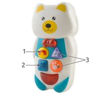 Telefon posiada duże kolorowe przyciski, które po naciśnięciu wydobywają dźwięk i powodują zaświecanie się. Dostosowany jest swoimi gabarytami do małych rączek dziecka.