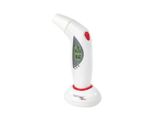 Termometr TOPCOM HEALTH 201 Zareaguj szybko na możliwą chorobe, dzięki odpowiedniemu termometrowi. Wykonaj pomiar temperatury ucha oraz czoła z kliniczną dokładnością w ciągu zaledwie 2 sekund. Termometr douszny Termometr na czoło Temperatura pokojowa Data - godzina Termometr douszny Termometr na czoło Temperatura pokojowa Data - godzina Temperatura pokojowa Data i godzina Strefy pamięci: 30 Technologia podczerwieni Czytelny wyświetlacz LCD (trójkolorowy) Podświetlenie wyświetlacza Technologia podczerwieni Strefy pamięci: 20 Alarm oznaczający gorączke powyżej 38° C/zmiana koloru wyświetlacza na pomarańczowy 3 kolory na wyświetlaczu LED (zielony, pomarańczowy oraz czerwony) dla wskazania zakresu temperatury Pomiary sekwencyjne (w 3 sekundy) Zmiana na stopnie Celsjusza lub Farenheita Czytelny wyświetlacz LCD Podświetlenie wyświetlacza Data i godzina Energooszczedne automatyczne wyłączanie Zasilanie: 1 x CR2032 Wysoka dokładność Szybki pomiar temperatury ciała w ciągu 2 sekund