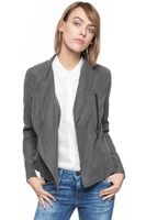 Nietuzinkowy, cienki żakiet o lekko dopasowanym kroju w głębokim odcieniu szarości. Designerski, krótki, ramoneskowy zamek pozwala urozmaicić codzienne stylizacje. Wykonany z ekologicznego włókna (lyocell), które swoimi właściwościami przewyższa najlepsze