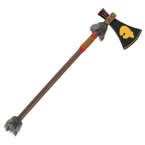 Toporek Indianina w całości wykonany z plastiku, ozdobiony piórkami i wstawkami materiału. Czarne ostrze zdobione jest sylwetką niedźwiedzia.