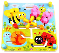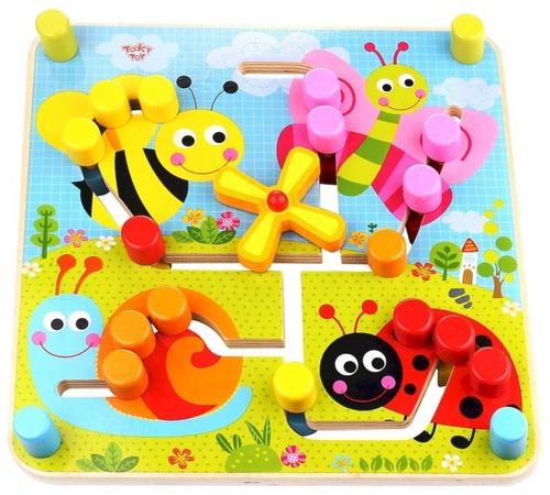 Dwustronny labirynt idealny dla najmłodszych dzieci który jest pozbawiony ostrych krawędzi, dobrze wygładzony, pomalowany jest nietoksycznymi farbami i lakierami. Dwustronny Labirynt to drewniana tablica ze specjalnie wyciętymi kanałami po których przesuwamy barwne koraliki. Każda ze stron tablicy ma inny wizerunek. Na jednej jest kolorowa łąka z wizerunkami: pszczółki, motylka, biedronki i ślimaka. Na drugiej stronie namalowane są kształty geometryczne: trójkąt, gwiazdka, koło i kwadrat.