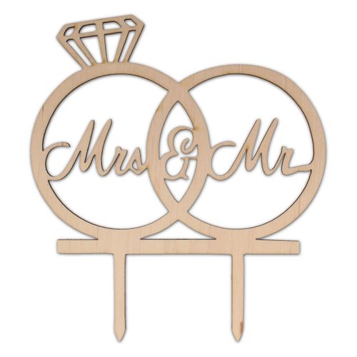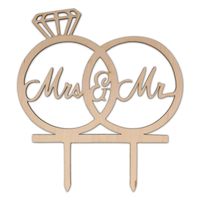 Drewniany topper weselny przedstawiający połączone obrączki, symbolizujące miłość pary młodej oraz napis mr&mrs.