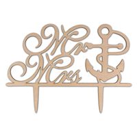 Drewniany topper na tort weselny przedstawiający kotwicę, symbolizującą odnalezienie celu, zaklimatyzowanie się w danej sytuacji. Do tego kotwicę zdobi napis Mr&Mrs odnoszący się do Młodej Pary.