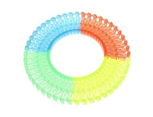 220 ELEMENTÓW + SAMOCHÓD – w zestawie znajduje się 220 elementów toru, występuje on w 4 kolorach, żółty, pomarańczowy, zielony, niebieski oraz 1 samochodzik. Autko zasilane jest bateriami, dzięki czemu z dużą prędkością porusza się po torze, a jego przyczepność jest na tyle mocna, że nie wylatuje z toru podczas zabawy. Dodatkowo podczas jazdy samochodzik świeci, jego światełka migają w kolorze czerwono-niebieskim.