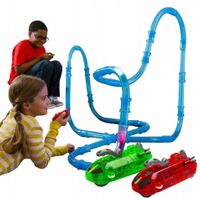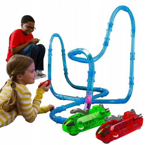 Pojazdy i piłeczka świecą w ciemności więc dla lepszego efektu zalecamy zgasić światło podczas zabawy. Olbrzymią zaletą tego zestawu jest to że nie ma tutaj ograniczeń co do długości toru, zależy ona tylko od ilości posiadanych elementów, które w dowolnym momencie można dokupić i łączyć ze sobą.