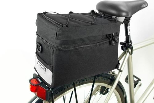 Pojemna sakwa rowerowa na bagażnik Basic Tom, wykonana z wytrzymałego poliestru i mocowana za pomocą taśm na rzep, posiada dodatkowy panel, pozwalający na zwiększenie objętości aż o 1 l.