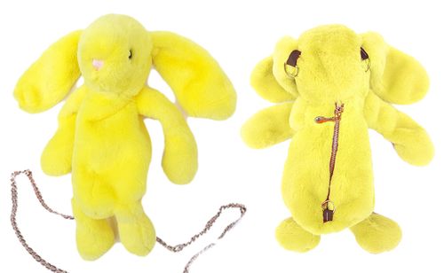 Pluszowa torebka w kształcie króliczka na złotym łańcuszku, która pomieści mały portfelik i telefon. Zapinana na zamek błyskawiczny. Prezentuje się uroczo. Wykonana z miłego w dotyku materiału. Po odpięciu łańcuszka może pełnić funkcję maskotki przytulanki.