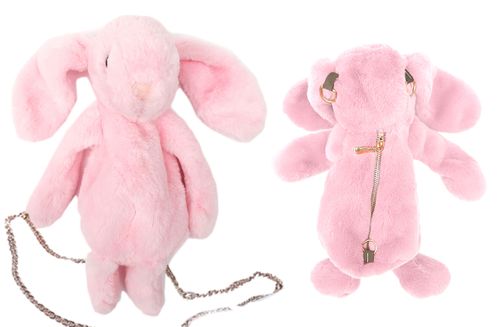 Pluszowa torebka w kształcie króliczka na złotym łańcuszku, która pomieści mały portfelik i telefon. Zapinana na zamek błyskawiczny. Prezentuje się uroczo. Wykonana z miłego w dotyku materiału. Po odpięciu łańcuszka może pełnić funkcję maskotki przytulanki.