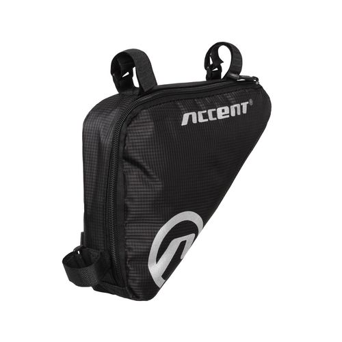 Torebka trójkątna pod tylną część ramy. Wykonana z bardzo trwałego, odpornego na ścieranie i rozrywanie poliestru 400D. Mocowana do ramy za pomocą taśm z rzepem. Wodoodporna. Odblaskowe logo dla poprawy bezpieczeństwa na drodze.