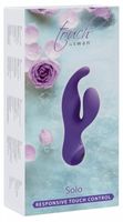 G-spot vibrator with a bulging, curved shaft and a narrow, flattened tip. The vibrator also has a bulging clitoral stimulator. 2 motors – one in the shaft and one in the clitoral stimulator. 3 vibration modes in the shaft and 7 vibration modes in the clitoral stimulator. It has an On/Off button and a small touch-sensitive area that can control the vibrations when the person swipes up, down or across the area. The vibrations can be controlled separately. The travel lock prevents the vibrator from turning on when it's not meant to. Includes a satin storage bag and instruction manual. It can be recharged wit the included USB cable. Purple. Complete length 17.3 cm, insertion depth 8.4 cm, Ø 1.9-3.5 cm. Silicone with a PU coating.