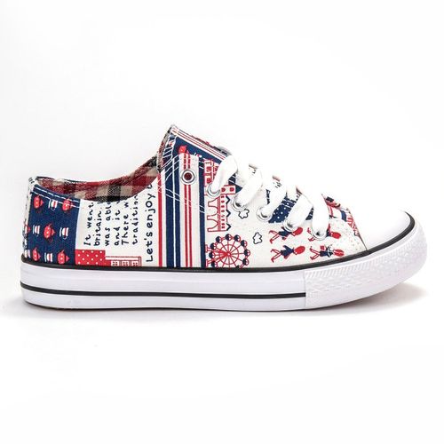 Trampki SHELOVET to tekstylne buty damskie z zaokrąglonymi białymi noskami i platformami o wysokości 2 cm, które zapewniają dobrą izolację od podłoża. Ten klasyczny fason butów jest wiązany na sznurówki umożliwiające wygodne dopasowanie obuwia do stopy, a cholewki mają ciekawy wzór, który stanowi ozdobę butów.