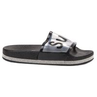 Transparentne klapki z czarnymi elementami, ozdobione błyszczącymi dżetami. Buty zostały wykonane z bardzo wysokiej jakości gumy. Sprawdzą się na plaży oraz basenie, nie zaszkodzi im wilgoć. Klapki przypadną do gustu wszystkim miłośniczkom mody, które chcą być na bieżąco z najnowszymi światowymi trendami.