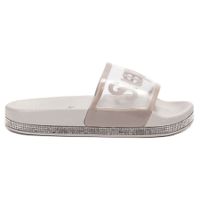 Transparentne klapki w kolorze szarym, ozdobione błyszczącymi dżetami.Buty wykonano z wysokiej jakości gumy. Dzięki temu sprawdzą się na plaży czy basenie. Klapki doskonale wpisują się w najnowsze światowe trendy w modzie. Ten model obuwia z pewnością trafi w gust pań, które uwielbiają eksperymenty z modą.