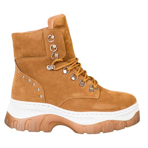 Brązowe traperki za kostkę Seastar, to solidne obuwie damskie na sezon jesienno-zimowy. Buty te wykonane zostały z tworzywa skóropodobnego, posiadają one masywną podeszwę z platformą, a także mocne sznurowadła, ułatwiające dopasowanie obuwia do stopy. Komfortowe użytkowanie zapewni wkładka ze skóry ekologicznej.