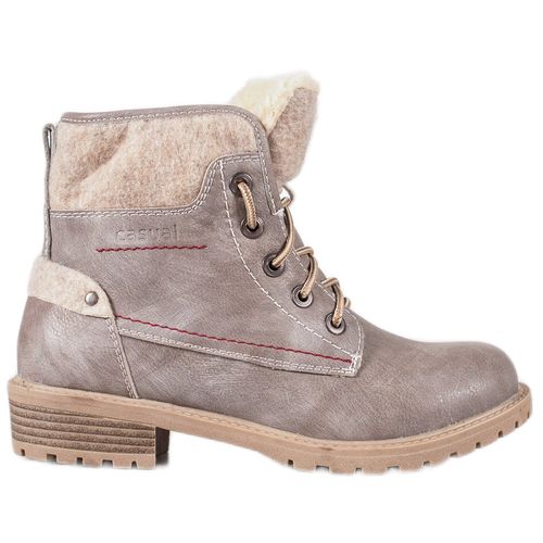 Traperki damskie Goodin wykonane są z tworzywa skóropodobnego w kolorze szarym, dzięki czemu pasować będą do wielu casualowych stylizacji. Są to buty ocieplane, dlatego doskonale sprawdzą się nawet w czasie mroźnych dni. Posiadają one również podeszwę z bieżnikiem, 4-centymetrowy obcas, a także sznurowanie.