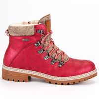 Jak przystało na zimowe i jesienne buty, te czerwone traperki ze skóry ekologicznej ocieplone są w środku ciepłym i miękkim kożuszkiem. Podeszwa z tworzywa sztucznego jest bardzo mocna i ma bieżnik, więc kobieta nie poślizgnie się na lodzie. Wkładka z kożuszka dobrze chłonie pot i chroni przed zimnem.