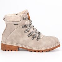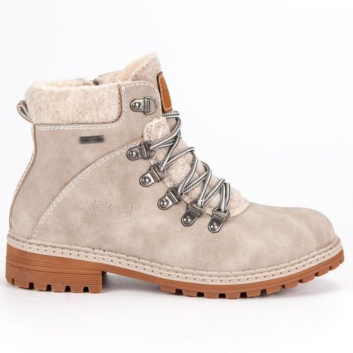 Traperki łączą w sobie kilka kolorów, zaczynając od beżowej skóry ekologicznej odpornej na działanie wody, śniegu i zimna. Na sznurowadłach widać natomiast wzór w kolorach białym i srebrnym. Buty te mają także brązową podeszwę z tworzywa sztucznego. Widać w niej głęboki bieżnik. Jest to damskie obuwie codzienne.