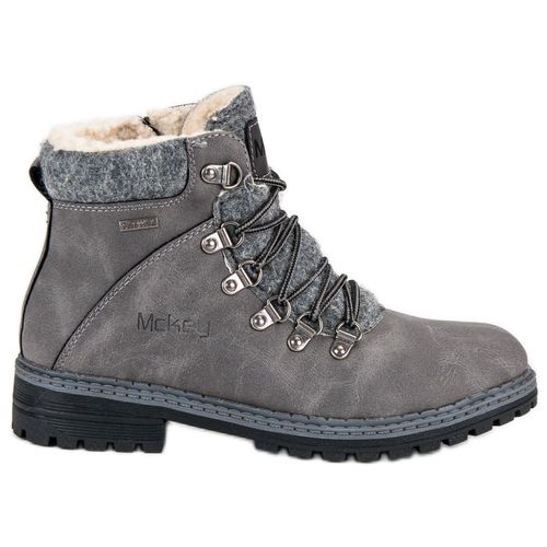 Kobiece traperki zrobiono z szarej skóry ekologicznej. Kolor ten jednak nie jest jednolity, co dodaje im uroku i sprawia, że będą się wyróżniały mroźną zimą czy mokrą jesienią. Buty te mają wodoodporną podeszwę z bieżnikiem zrobioną z tworzywa sztucznego. Dekoracją w ich przypadku jest futerko na cholewce.