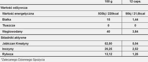 REACTOR PRO 3 to zaawansowany stack kreatynowy zwiększający produkcję ATP (adenozynotrójfosforanu). Zawiera łatwo przyswajalny jabłczan kreatyny oraz rybozę i inozynę. Regularna suplementacja 3 g kreatyny dziennie zwiększa wydolność fizyczną w przypadku następujących po sobie krótkich, bardzo intensywnych ćwiczeń fizycznych. DAWKOWANIE Jednorazową porcję preparatu – 4 kapsułki stosować 3 razy dziennie. Preparat popić 300 ml wody. W dni treningowe: I porcja 30 min. przed pierwszym posiłkiem, II porcja 30 min. przed treningiem, III porcja bezpośrednio po treningu. W dni nietreningowe: I porcja 30 min. przed pierwszym posiłkiem, II porcja 30 min. przed głównym posiłkiem, III porcja 30 min. przed ostatnim posiłkiem.