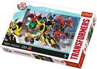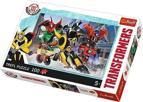 Puzzle 100 elementów z Transformersami. Po ułożeniu powstanie obrazek o wymiarach 41x27,8 cm. Wysoką jakość, nasycenie kolorów i bezpieczeństwo układania zapewnia kalandrowany papier odbijający światło i wykorzystanie materiałów ekologicznych.Wiekod 5 lat