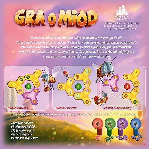 „Gra o miód” to gra logiczna, w której gracze starają się zdobyć jak najwięcej punktów. W tym celu dokładają dwustronne, trójramienne elementy do budowanego układu tak, aby symbole do siebie pasowały. Ta z pszczół, która wybuduje największy i najczystszy plaster zostanie przodownikiem ula!