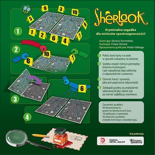 Gra polega na tym, że każda para fotografii miejsca zbrodni jest prawie identyczna. Zdjęcia różnią się bowiem kilkoma malutkimi szczegółami, które są pokazane na odwrocie kart. Twoim zadaniem jest znalezienie liczby różnic pomiędzy dwoma obrazkami miejsca zbrodni.