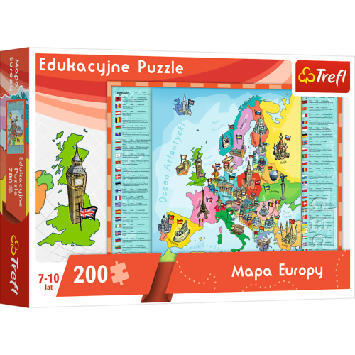 Mapa Europy to puzzle, które zwrócą uwagę zarówno dzieci, jak i ich rodziców. Prezentowane puzzle w przyjazny sposób łączą zabawę z nauką oraz pobudzają wyobraźnię i ciekawość świata. Układanka została specjalnie dostosowana do możliwości poznawczych dzieci w wieku 7-10 lat. Po ułożeniu powstanie obrazek o wymiarach 60x40 cm.