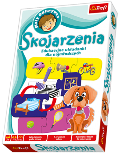 TREFL Skojarzenia Edukacyjne układanki dla najmłodszych Skojarzenia to wyjątkowa układanka dydaktyczna dla przedszkolaków – uczy nazywania i klasyfikowania przedmiotów oraz zjawisk. Podczas wesołej zabawy, polegającej na łączeniu puzzlowych elementów, dziecko poznaje otaczający je świat. Produkt dostarcza wiele pomysłów na zabawę – dziecko ma możliwość zabawy w pojedynkę, jak również w grupie rówieśników. Do gry dołączone są scenariusze i propozycje do wykorzystania przez rodziców. Opakowanie zawiera 24 trójdzielne kartoniki do układania oraz instrukcję z wieloma propozycjami zabaw. Duże elementy z grubej tektury, są pokryte wysokiej jakości farbami, co gwarantuje bezpieczną zabawę nawet dla małych dzieci Wyraźne rysunki i żywe kolory są dopasowane do stopnia rozwoju dziecka. Seria Mały Odkrywca to gry edukacyjne dla dzieci w wieku od 2 do 6 lat. Wszystkie pozycje zostały opracowane przez zespół specjalistów z różnych dziedzin: pedagogiki, filologii, logopedii, socjologii oraz psychologii. Każda z gier została przygotowana, by wspomagać rozwój poznawczy i intelektualny dziecka: rozwija myślenie logiczno-matematyczne, stymuluje rozwój słownictwa i zdolności komunikacyjne, ćwiczy koordynację wzrokowo-ruchową, trenuje pamięć i koncentrację, pobudza wyobraźnię oraz kreatywność. Nasze produkty to połączenie zabawy z elementami edukacyjnymi, a jednocześnie twórcze pomysły na spędzenie czasu z dzieckiem. Produkty z serii Mały Odkrywca są testowane przez dzieci oraz pozytywnie opiniowane przez nauczycieli przedszkolnych. Liczba graczy: 1-4 Wiek: 3+