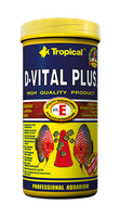 Wieloskładnikowy, witalizujący pokarm płatkowany z podwyższoną zawartością witaminy E, przeznaczony do codziennego karmienia tarlaków, paletek i innych wymagających gatunków ryb. D-Vital Plus ma bardzo wysoką wartość odżywczą, co sprzyja dojrzewaniu i rozrodowi ryb oraz produkcji śluzu pokarmowego przez parę rodzicielską paletek. Szczególną rolę w tych procesach odgrywa witamina E, dobrze przyswajalna lecytyna z żółtek jaj oraz łatwostrawne białko, pozyskane między innym ze smacznych kalmarów i kryla. Zawarta w pokarmie L-karnityna intensyfikuje metabolizm tłuszczów, dostarczając dodatkową dawkę energii, tak potrzebną podczas tarła i opieki nad potomstwem. W celu urozmaicenia diety paletek polecamy też inne pokarmy marki Tropical, np. D-50 Plus, Super Spirulina Forte.