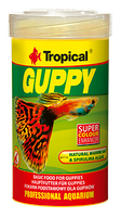 GUPPY to wieloskładnikowy pokarm w formie płatków przeznaczony do codziennego karmienia gupików, molinezji, platynek i innych ryb żyworodnych. Pokarm został wzbogacony o naturalną sól morską, która wpływa w korzystny sposób na poziom elektrolitów i ciśnienie osmotyczne, co ma bezpośredni związek z przebiegiem ciąż i porodem oraz żywotnością narybku i rodziców, zwłaszcza samiczek. Zawarta w pokarmie spirulina i błonnik, stanowiący mieszaninę substancji pochodzenia roślinnego, które nie ulegają trawieniu, sprawia, że przewód pokarmowy ryb funkcjonuje prawidłowo. Wysoki poziom białka w połączeniu z optymalnie dobranym zestawem witamin i mikroelementów zapewnia rybom doskonałą kondycję, równomierny wzrost i zdrowie.
