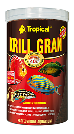 Pokarm w formie tonącego granulatu z wysoką zawartością kryla antarktycznego (40%). Przeznaczony do codziennego karmienia wszystkożernych i mięsożernych ryb w akwariach morskich i słodkowodnych. Ze względu na dużą smakowitość szczególnie sprawdza się w żywieniu ryb, które nie znają pokarmów gotowych (ryby z odłowu), oraz ryb o wysokich wymaganiach pokarmowych. Zastosowany w pokarmie kryl antarktyczny wzbogaca go o cenne białko, aminokwasy, chitynę, nienasycone kwasy tłuszczowe, w tym Omega-3, oraz pochodzące z naturalnego źródła karotenoidy. Ryby żywione regularnie pokarmem KRILL GRAN osiągają intensywne barwy i doskonałą kondycję oraz chętniej przystępują do tarła.