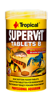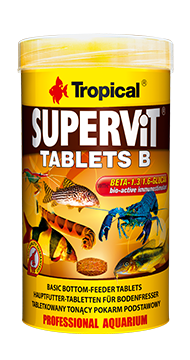 SUPERVIT TABLETS B to pokarm w formie tonących tabletek do codziennego karmienia wszystkożernych i mięsożernych ryb strefy dennej, w tym również większych sumów, egzotycznych ślimaków i żółwi wodnych. Potrzeby żywieniowe i energetyczne ryb zabezpiecza niezwykle bogata receptura, na którą składa się kilkadziesiąt wyselekcjonowanych składników najwyższej jakości, w tym skorupiaki, mięczaki i glony. Układ immunologiczny ryb w walce z patogenami wspierają beta-glukan oraz stabilizowana witamina C.