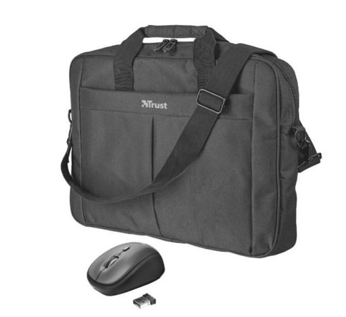 Poręczny zestaw podróżny składający się z myszy bezprzewodowej i ochronnej torby na laptopy o rozmiarze do 16", urządzenia peryferyjne i inne akcesoria