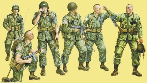 Zestaw zawiera 6 figurek spadochroniarzy amerykańskich z charakterystycznymi fryzurami na "Irokeza".